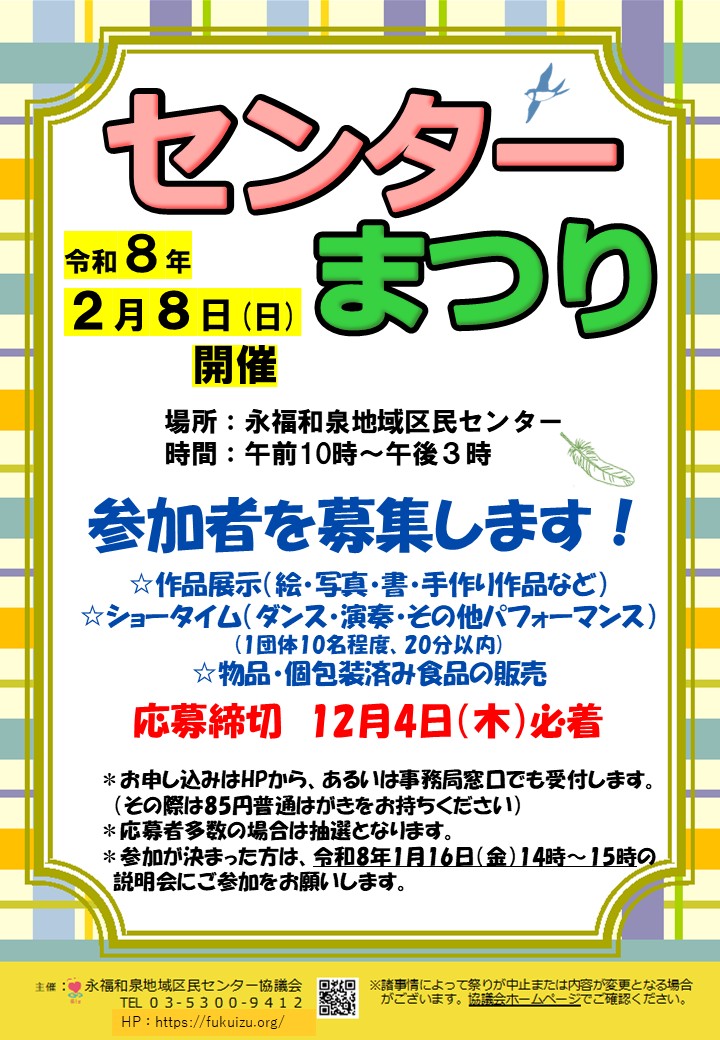 - 永福和泉区民センターを利用しているグループまたは周辺地域にお住まいの方(業者は不可)