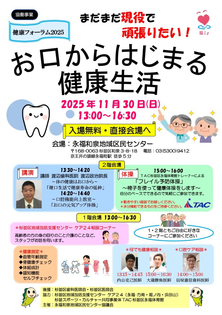 開催日2025年11月30日(日) 時間午後1時~午後4時30分 場所永福和泉地域区民センター 1階~2階 参加対象どなたでも 定員特になし 参加費無料 申込締切 申込方法申込み不要、直接会場へお越し下さい。
